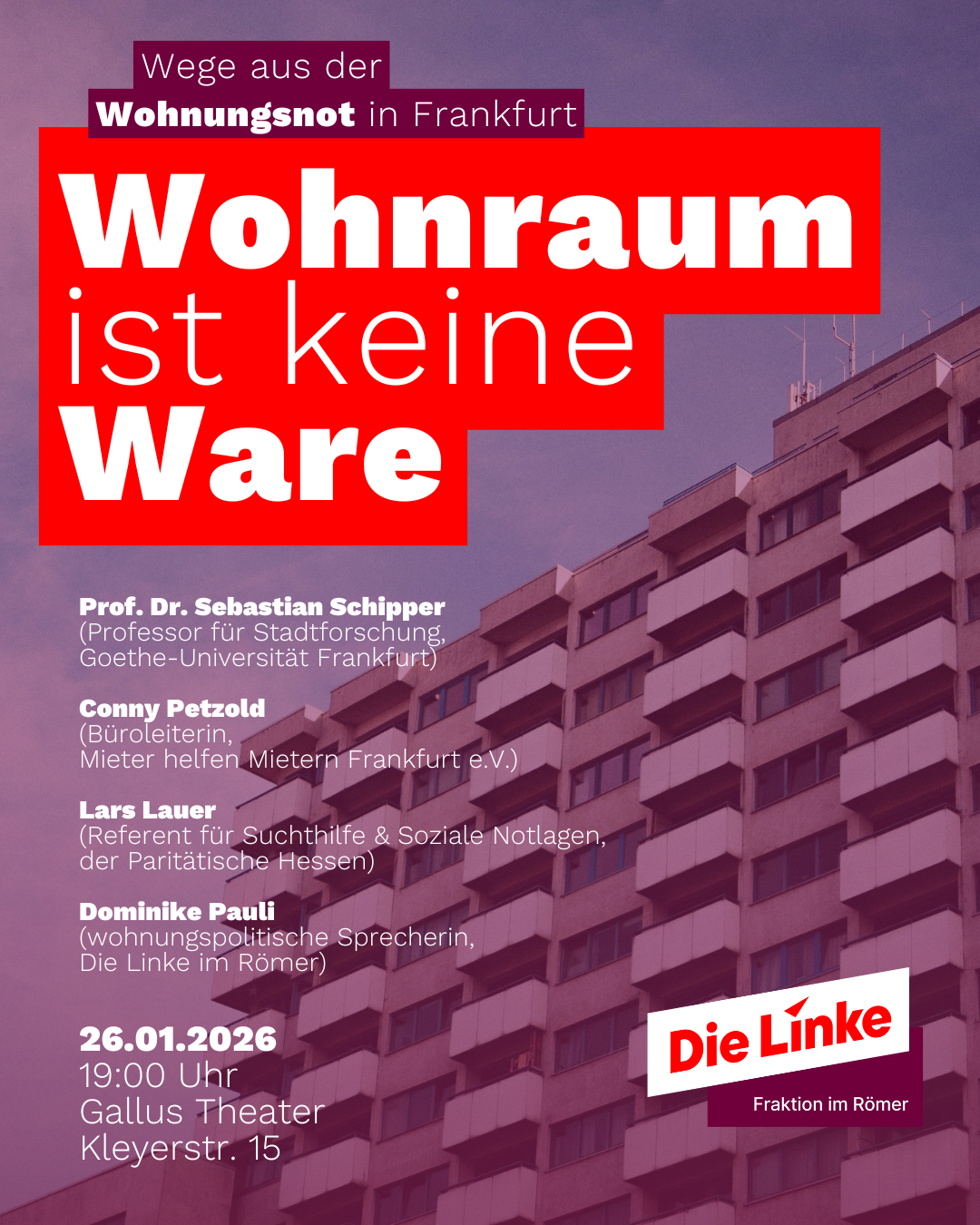 Pauli abschließend: „Frankfurt muss endlich anfangen, die Bedarfe und Nöte der Menschen ernst zu nehmen. Wir dürfen nicht die Fehler der Vergangenheit wiederholen. Tausende müssen seit Jahren in menschenunwürdigen Notunterkünften verharren. Zwei Drittel der Menschen in dieser Stadt haben vom Einkommen her Anspruch auf eine geförderte Wohnung. Viele müssen die Stadt verlassen, weil sie es sich nicht mehr leisten können. Der neue Stadtteil könnte eine Chance für Frankfurt sein, die jedoch vertan wird, wenn weitere Luxuswohnungen gebaut werden. Frankfurt braucht endlich bezahlbaren Wohnraum für alle.“
