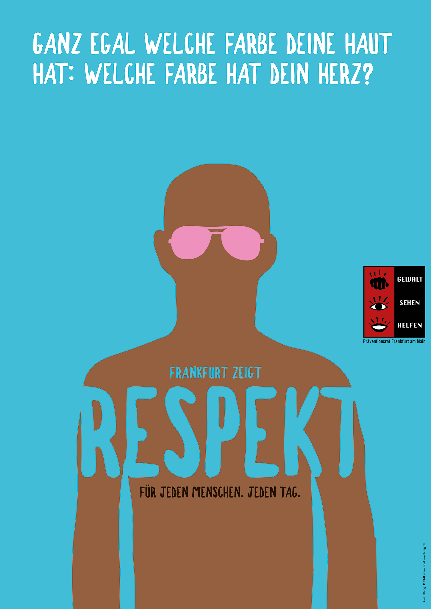 Auch wenn es wichtig ist, Homosexuellenfeindlichkeit gegen schwule Männer anzusprechen, wäre es vielleicht auch sinnvoll gewesen, die anderen in den Fokus zu nehmen. Das Plakat mit dem schwarzen Mann hat einen tollen Satz, der mich sehr berührt hat. Da steht: „Ganz egal, welche Farbe deine Haut hat: Welche Farbe hat dein Herz?“ Das Problem ist aber die rosafarbene Sonnenbrille. Diese Sonnenbrille bedient sich dem Stereotyp vom coolen schwarzen Mann, der infantil und unseriös wirkt. Ich sehe keinen Grund, diese Sonnenbrille beizubehalten. Sinnvoller wäre eine Lesebrille, wie wäre es damit, oder gar keine Brille.